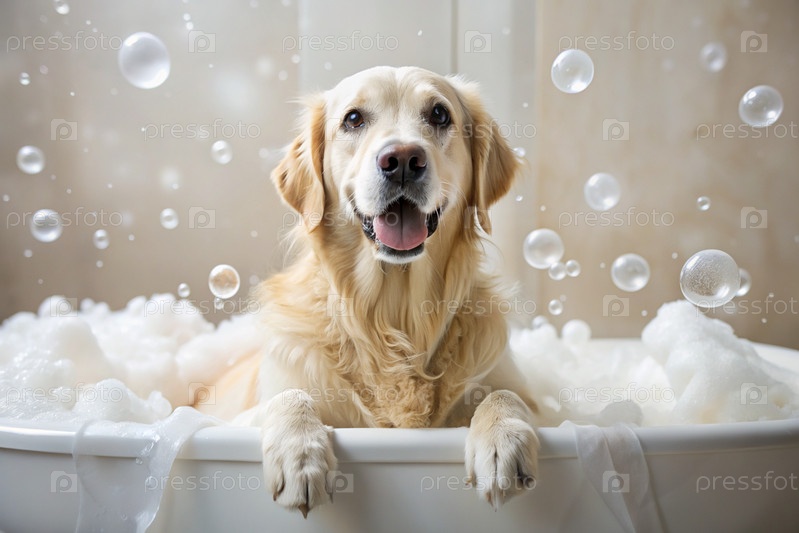 Золотой ретривер купается в пузырьковой ванне. Помыть собаку. Концепция ухода за домашними животными
