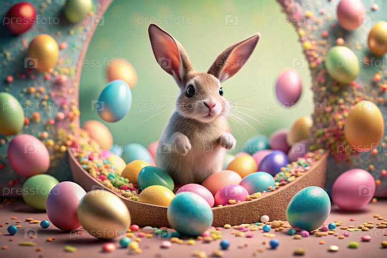 Известный праздник. милый пасхальный кролик заглядывает из ямы с красочными яйцами вокруг. концепция счастливой Пасхи