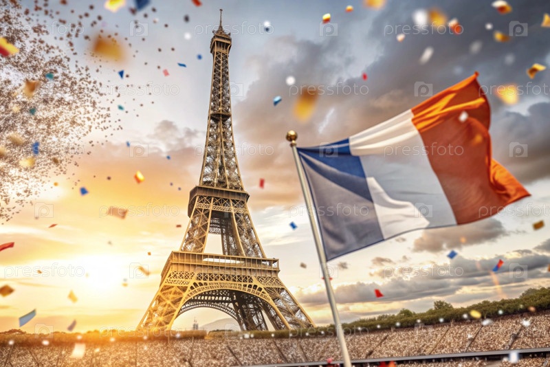 14 июля - Национальный день Франции. Государственный флаг Франции на Эйфелевой башне. Триколор. Концепция Олимпийских игр во Франции 2024
