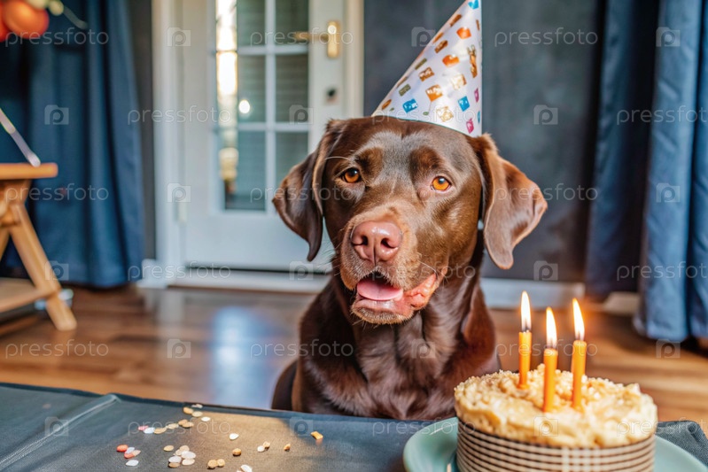 Собака сидит с тортом, воздушными шарами и флагами на вечеринке по случаю дня рождения