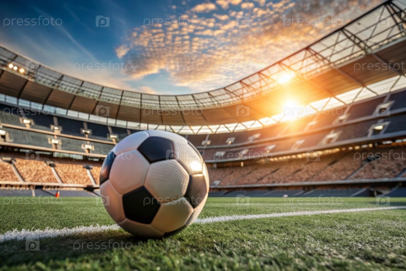 Футбольный мяч на зеленом поле футбольного стадиона, готовый играть в центре поля