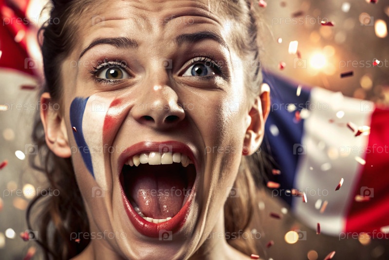 Красивая спортсменка или чирлидер из Франции с радостными криками после победы на Олимпийских играх на фоне французского флага