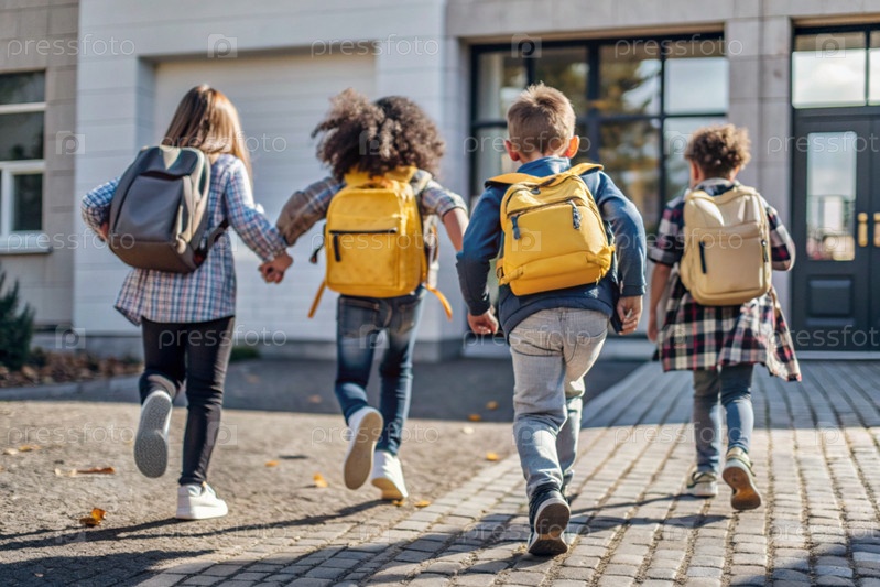 Праздник приходится на 1 сентября. Дети с желтыми рюкзаками бегут в школу. Обратный взгляд. Давайте вернемся в школу. Концепция нового учебного года в школе. Осенний день знаний
