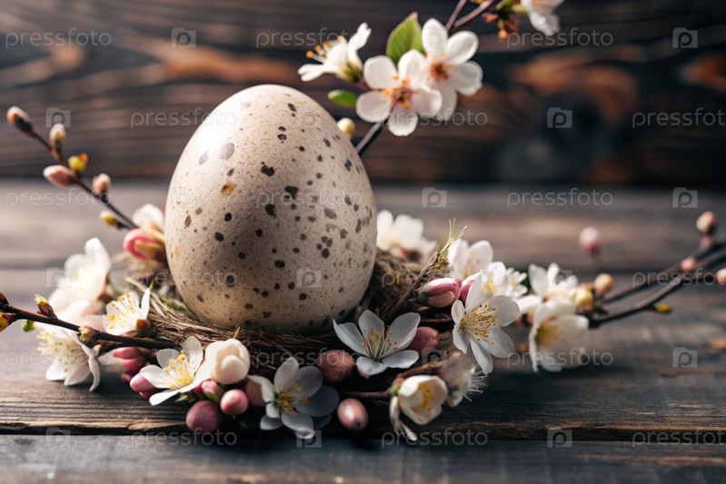 Пасхальный баннер. Концепция яркого пасхального праздника. Необычное деликатное пасхальное яйцо с нежными белыми цветами