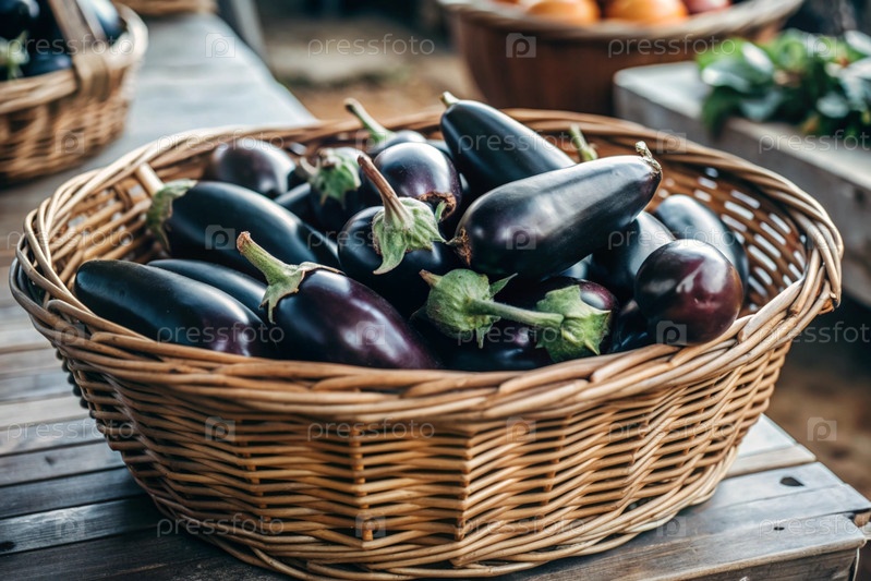 Концепция выращивания продуктов питания. свежие органические баклажаны на фермерском рынке. богатый урожай баклажан в плетеновой корзине