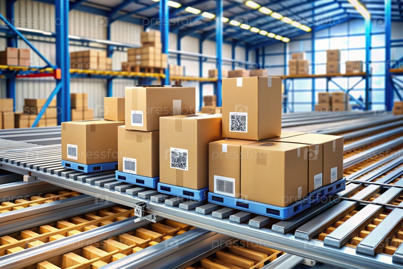 Интеллектуальная автоматическая упаковка посылок на складе, теги и QR-коды в картонные коробки для эффективного отслеживания, аутентификации и слежения