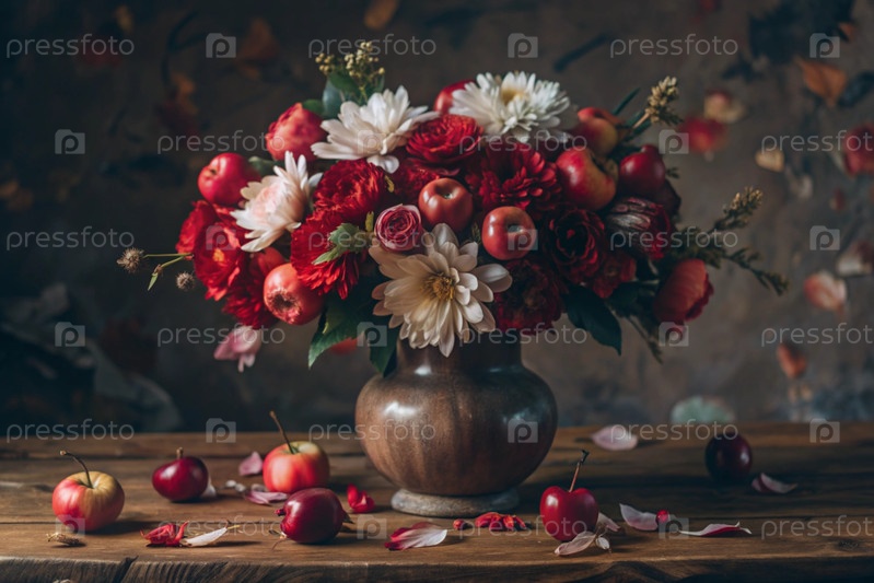 Красочное лето, осенний букет цветов различных красных, розовых, белых оттенков в вазе и спелые красные яблоки на столе