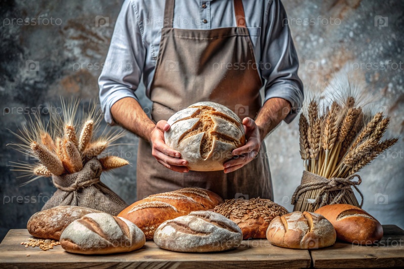 Свежий вкусный хлеб в руках пекаря-мужчины на близком расстоянии. свежевыпеченный кислый хлеб с золотой корой. пекарня со вкусным хлебом. кондитерские изделия