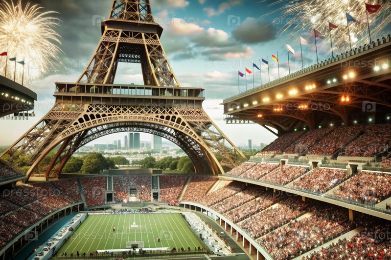 14 июля - Национальный день Франции. Государственный флаг Франции на Эйфелевой башне. Триколор. Концепция Олимпийских игр во Франции 2024