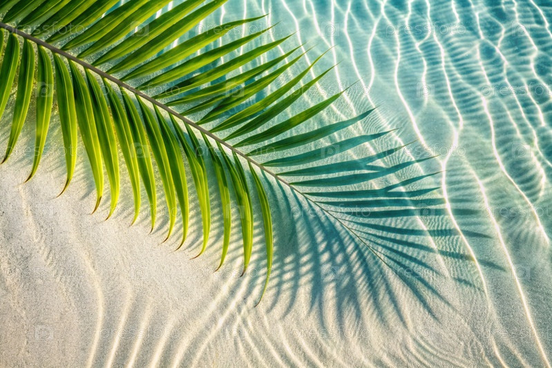 Концепция летнего отдыха на пляже. Вид тропических листьев на поверхности воды. Тень пальмовых листьев на белом песчаном пляже. Красивый абстрактный фон для баннера