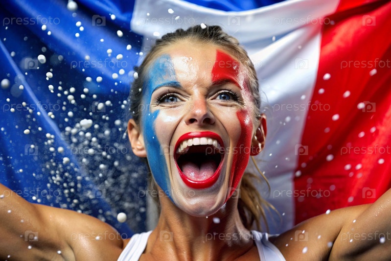 Красивая спортсменка или чирлидер из Франции с радостными криками после победы на Олимпийских играх на фоне французского флага