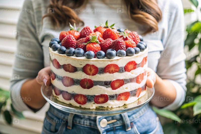 Концепция праздничных блюд. Красивый и вкусный десерт в руках женщины. Торт со свежими клубниками и черники. Лекарства и сладости