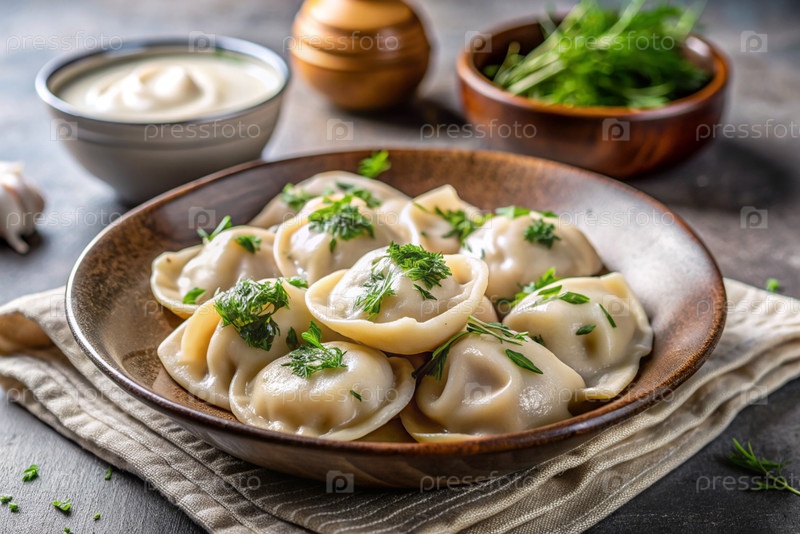 Русская кухня, пельмени в керамической миске с сметаной и травами
