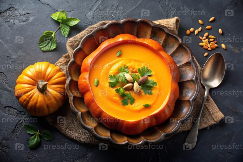 Традиционный мягкий тыквенный кремовый суп с сливками и семьями тыквы на черном бетонном фоне