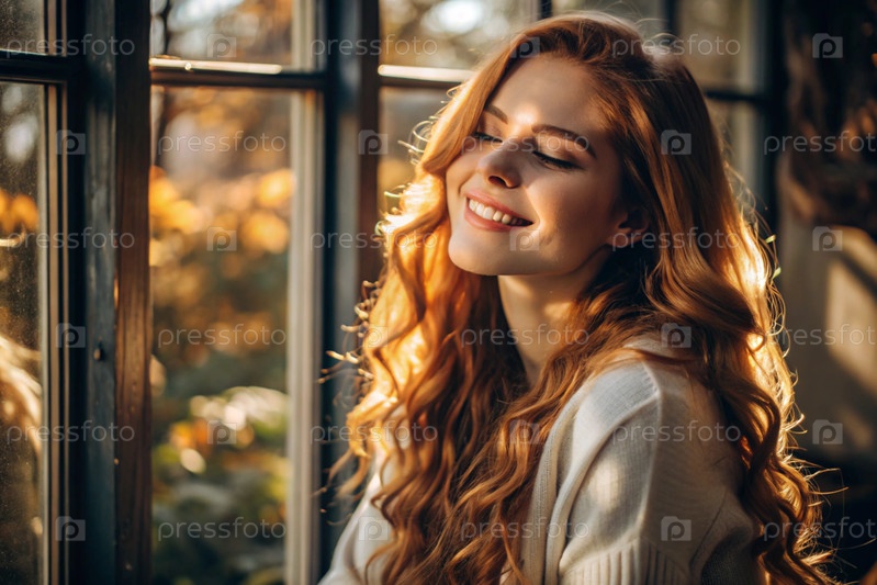 Портрет красивой улыбающейся рыжеволосой девушки с кудрявыми волосами у окна, где светит теплое осеннее солнце
