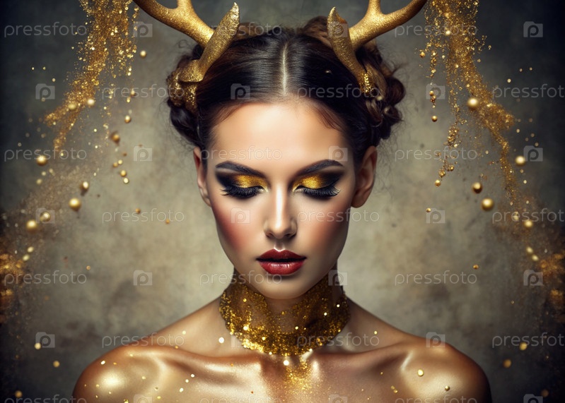 Творческий баннер для салона красоты в черно-золотых тонах. Профессиональный макияжный художник, стилист и парикмахер. Красивая женщина с вечерним гримом и золотыми рогами на голове. Индустрия красоты
