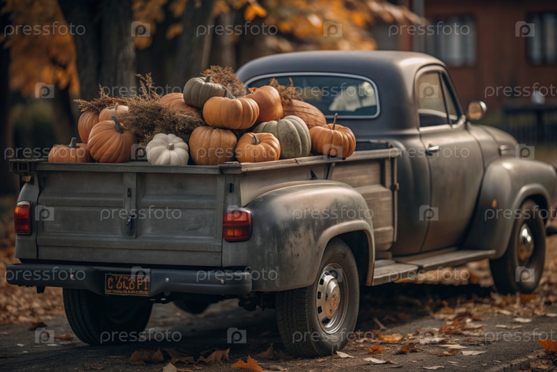Осень, осенний дизайн.Большой урожай тыквы на заднем сиденье ретро-пикапа, крупный план