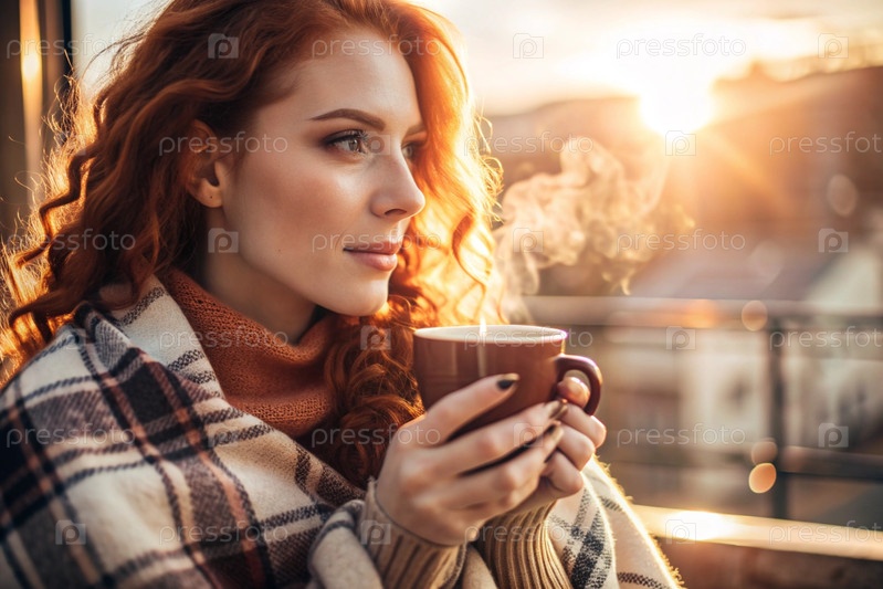 Красивая рыжеволосая женщина, завернутая в клетку с кружкой горячего кофе на красивом террасе под лучами заходящего солнца