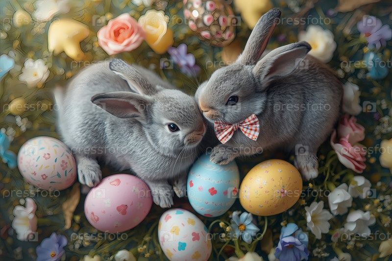 Пасхальные кролики лежат на пасхальных яйцах и смотрят в камеру