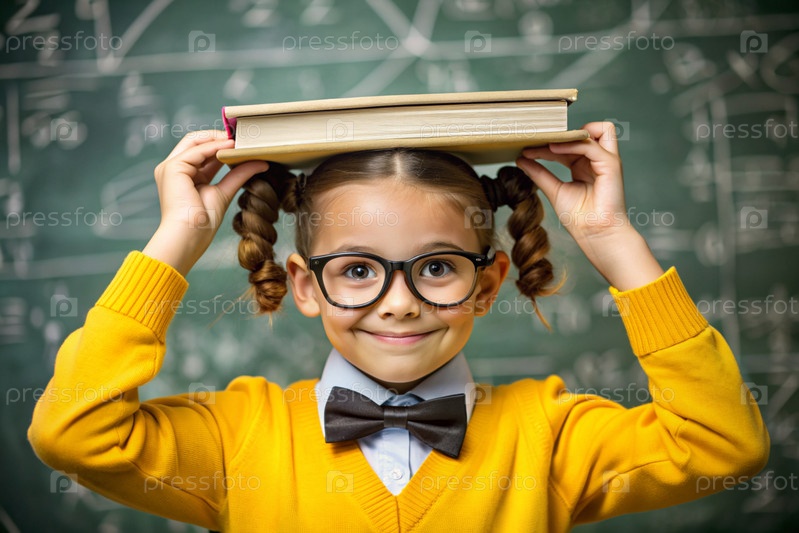 Красивая девушка с очками и книгами на голове. Ребенок впервые идет в школу. Ребёнок в классе со доской на заднем плане. Возвращение к школе