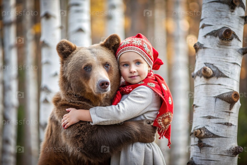 Красивая маленькая девочка в русской народной одежде и с платками на голове в березовой роще с живым медведем Русский фольклор, славянская мифология