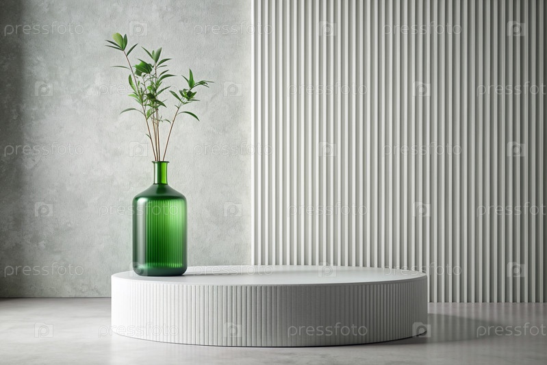 Минимальный фон для демонстрации продукта. Современная сцена подиума с текстурированной бетонной стеной и стеклянной вазой. Элегантный дизайн для презентации продукта