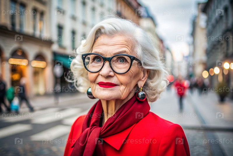 Портрет стильной, модной пожилой женщины, пенсионерки 70 лет на французской улице в очках, черном берете и ярко-красной одежде