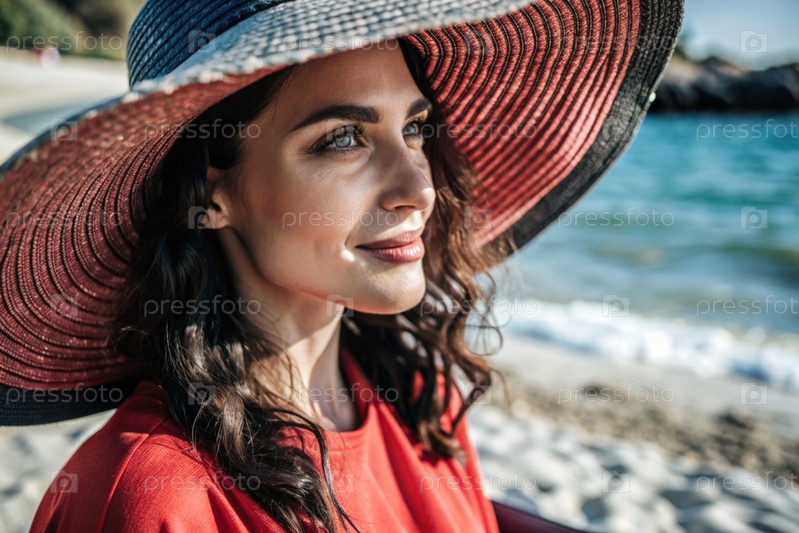 Летние каникулы на пляже, крупный план красивой женщины в соломенной шляпе.Лето.Отдых и отдых, место для копирования
