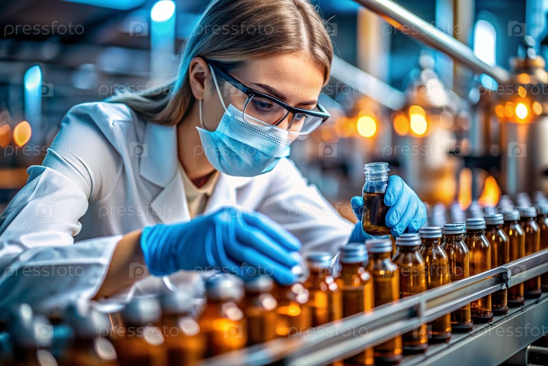 Производство лекарств: фармацевт тестирует медицинские флаконы на автоматическом трубопроводе фармацевтической производственной линии с использованием искусственного интеллекта