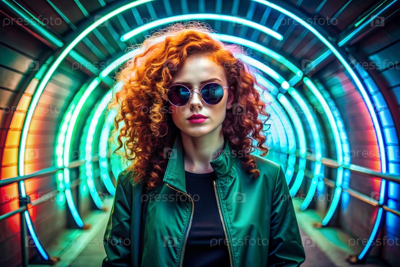 Молодая стильная красивая девушка в солнцезащитных очках стоит в неонном туннеле среди неоновых вывесок
