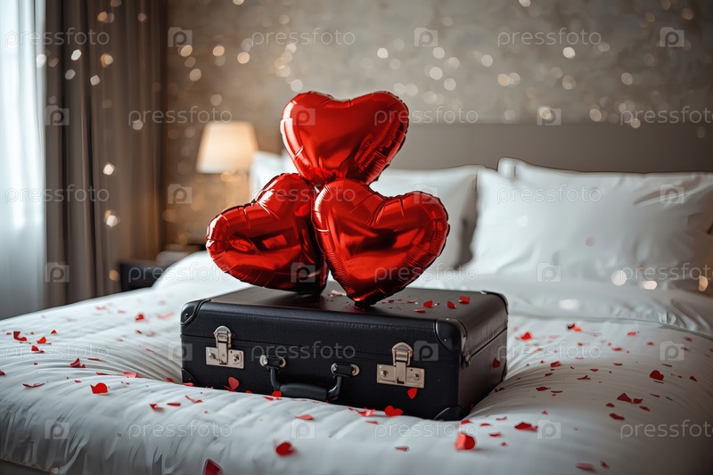 Балонный чемодан в форме сердца в гостиничном номере, чтобы отпраздновать День святого Валентина.Романтический праздник для двух любовников, действие 14 февраля