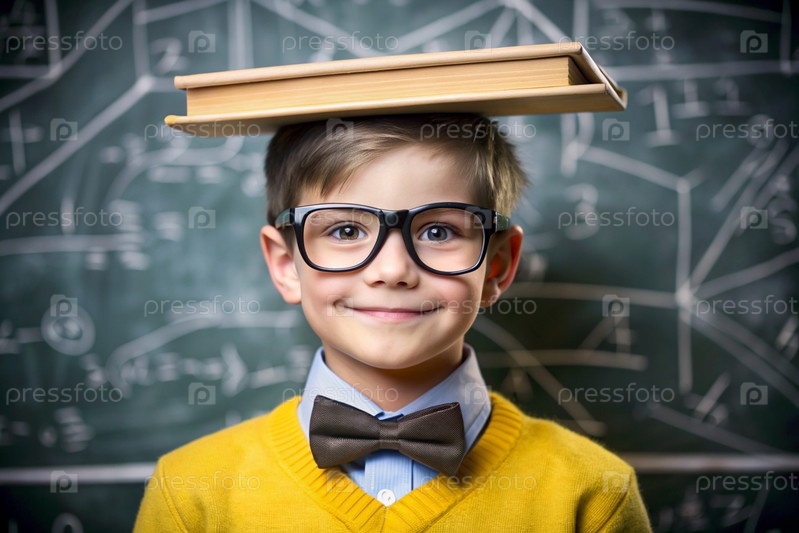 Милый мальчик с очками и книгами на голове. Ребенок впервые идет в школу. Ребёнок в классе с доской на заднем плане. Возвращение к школе