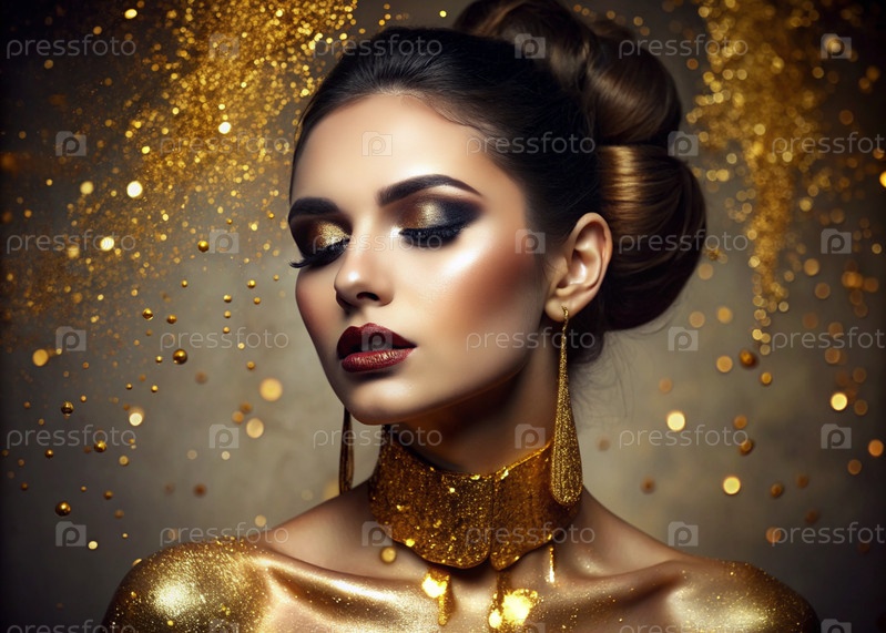 Творческий баннер для салона красоты в черно-золотых тонах. Профессиональный макияжный художник, стилист и парикмахер. Модный праздничный макияж. Красивая женщина с вечерним гримом. Индустрия красоты