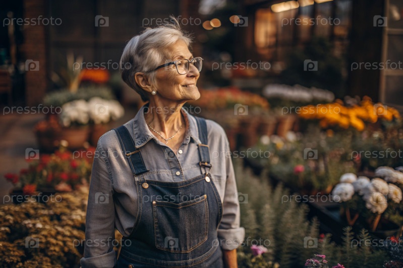 Пожилой садовник с седыми волосами в комбинезоне в уютной цветочной теплице