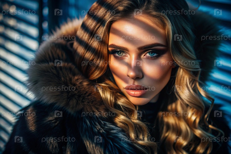 Красивый портрет российской модели в мехах на нейтральном синем фоне с контрастным освещением и тенями
