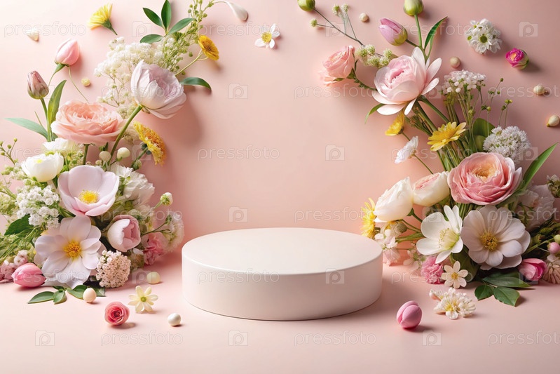 Минималистский розовый пастельный фон для демонстрации продукта.Современная подиум с розовой стеной и цветами вокруг.Креативный дизайн презентации продукции