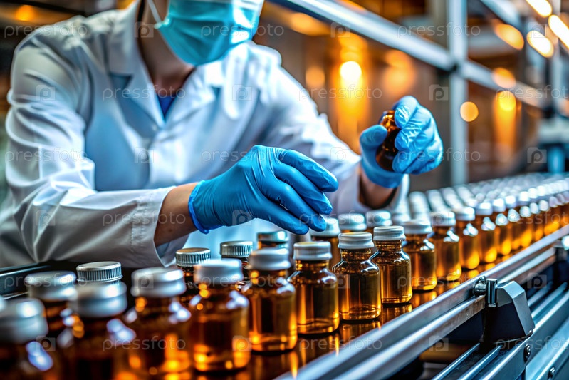 Производство лекарств: фармацевт тестирует медицинские флаконы на автоматическом трубопроводе фармацевтической производственной линии с использованием искусственного интеллекта