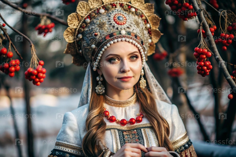 Красивая девушка в традиционном русском национальном костюме. на фоне елок. портрет символизирует традиции и красоту русского народа