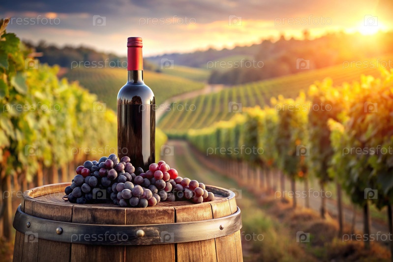 Бутылка красного вина и куча спелых виноград на деревянной дубовой бочке на фоне виноградника