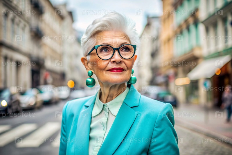 Портрет стильной, модной пожилой женщины, пенсионерки 70 лет на улице города с очками и ярко-тиркузовым костюмом