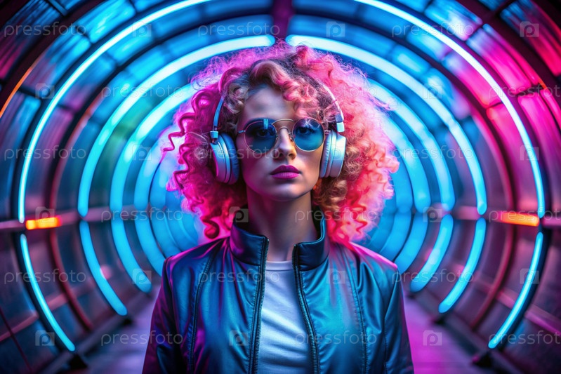 Молодая красивая девушка в солнцезащитных очках слушает музыку на больших беспроводных наушниках, стоя в неонном туннеле среди неоновых вывесок