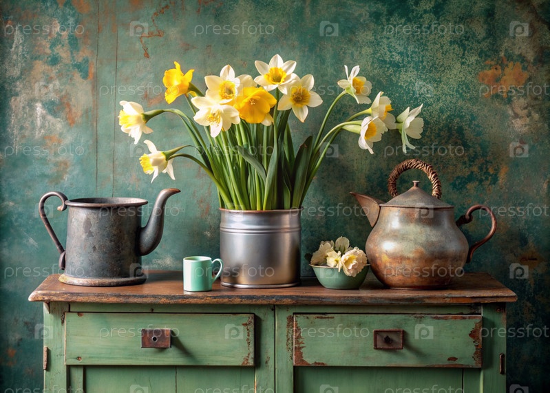 Красивые весенние нарциссы в железной винтажной вазе и горшки на старом деревянном шкафу. Букет цветов в вазе в интерьере дома. Желтый, зеленый, бежевый цветный фон