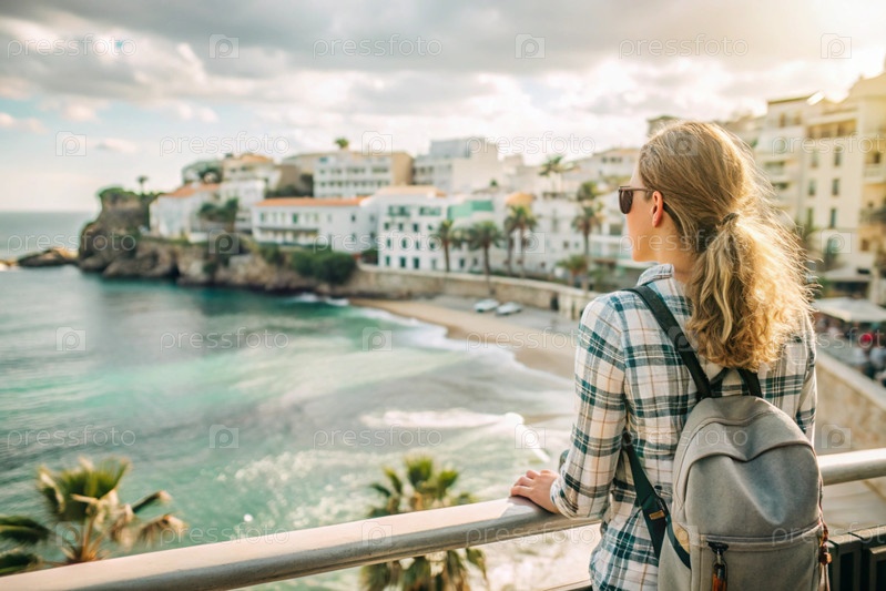 Девушка-путешественница с рюкзаком на фоне южного побережья моря. она путешествует и наслаждается жизнью и окружающей средой. туризм