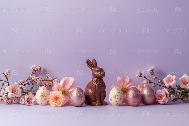 Счастливая Пасха 2026, минималистическое студийное фото. Шоколадный пасхальный кролик, пасхальные яйца и нежные весенние цветы. Мягкое освещение студии создает ощущение чистоты и воздушности
