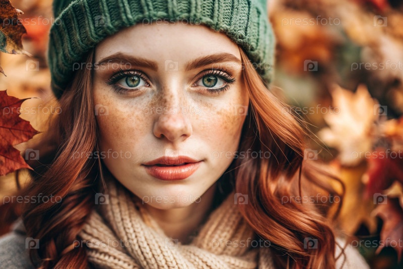 Осенний портрет. Близкий план молодой рыжеволосой женщины с выразительными зелеными глазами в вязанной шляпе и свитере