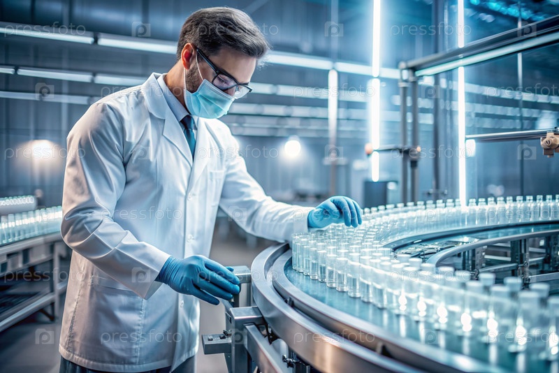 Производство лекарств: фармацевт тестирует медицинские флаконы на автоматическом трубопроводе фармацевтической производственной линии с использованием искусственного интеллекта