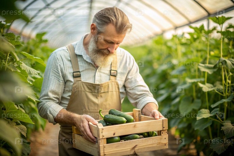 Сельскохозяйственная промышленность. деревянный ящик с огурцами в руках фермера-мужчины. садовник собирает богатый урожай в теплице
