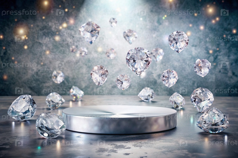 Минималистский фон для выставки ювелирных изделий. Современный пустой подиум с серой стеной и бриллиантами. Креативный дизайн презентации продукта