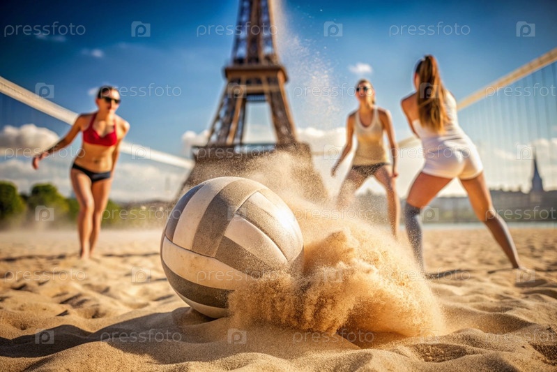 Момент, когда волейбол падает на песок, фиксируется в концепции летних олимпийских видов спорта среди размытой Эйфелевой башни