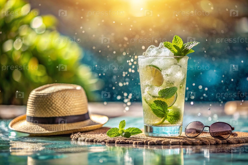 Коктейль алкоголя сочные фрукты с кубиками льда и нарезами лимона, лайма и мяты